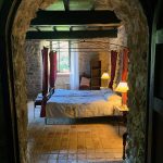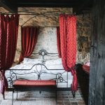 Eines der drei romantischen Schlafzimmer befindet ich an der Rückseite des Wohnzimmers und ist mit einem Himmelbett sowie einem eigenen Bad aus rotem Marmor der Region, inklusive Badewanne und Bidet, ausgestattet.
