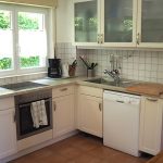 Die Küche ist umfassend ausgestattet: Elektroherd mit Backofen, Kühlschrank mit Eisfach, Spülmaschine, Kaffeemaschine sowie reichlich Geschirr und Besteck.